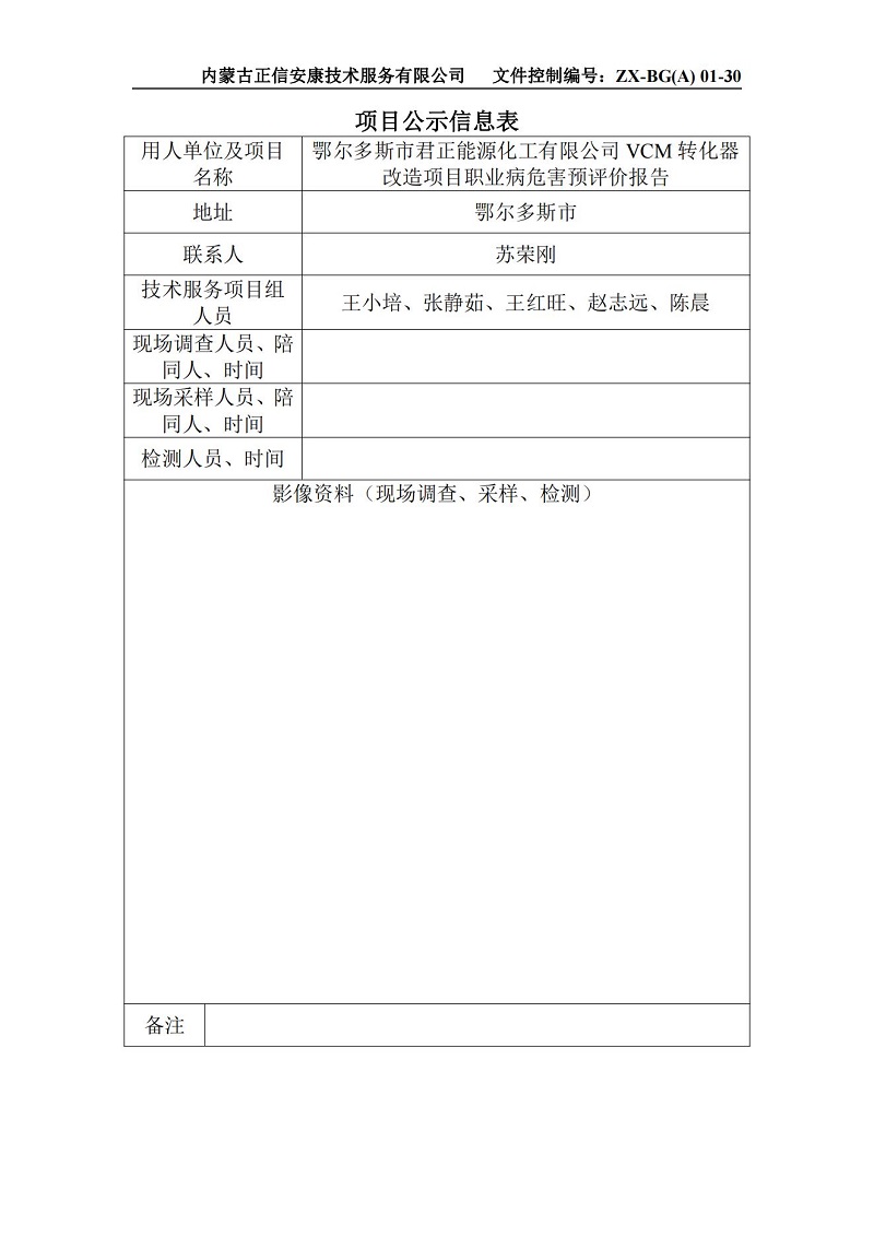 鄂爾多斯市君正能源化工有限公司VCM轉(zhuǎn)化器改造項目職業(yè)病危害預(yù)評價報告公示信息表