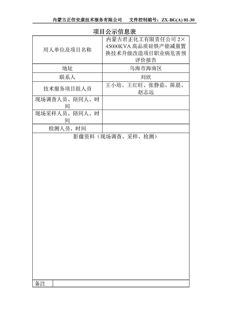 內(nèi)蒙古君正化工有限責(zé)任公司2×45000KVA高品質(zhì)硅鐵產(chǎn)能減量置換技術(shù)升級改造項(xiàng)目職業(yè)病危害預(yù)評價(jià)報(bào)告