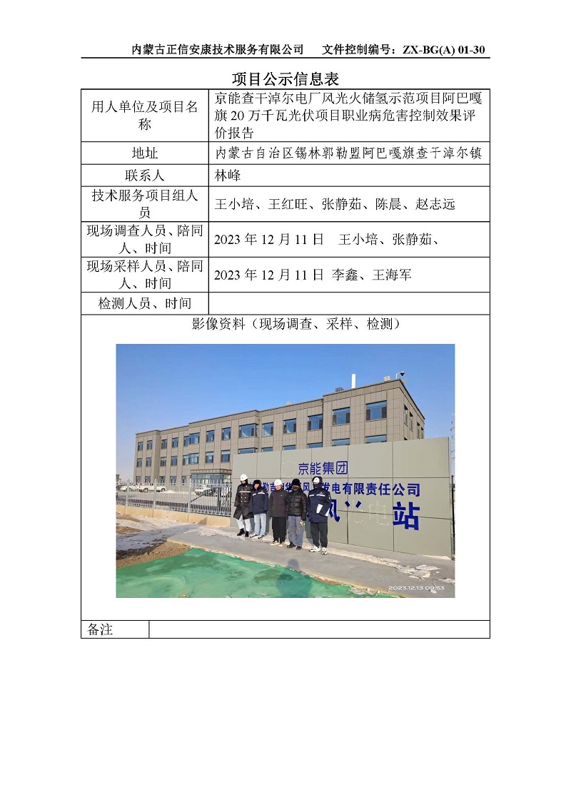 京能查干淖爾電廠風(fēng)光火儲(chǔ)氫示范項(xiàng)目阿巴嘎旗20萬(wàn)千瓦光伏項(xiàng)目職業(yè)病危害控制效果評(píng)價(jià)公示