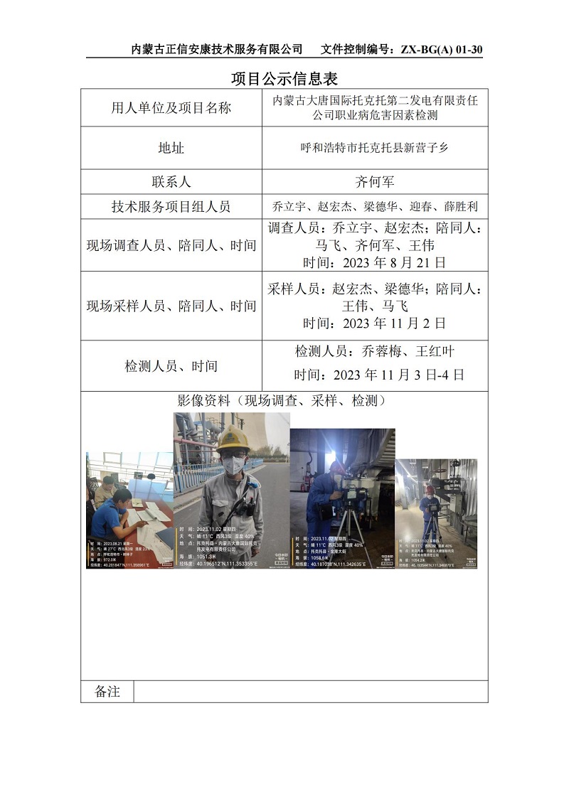 內(nèi)蒙古大唐國際托克托第二發(fā)電有限責(zé)任公司職業(yè)病危害因素檢測項目公示信息表(1)