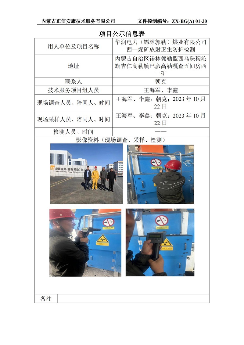 華潤電力(錫林郭勒)煤業(yè)有限公司西一煤礦放射衛(wèi)生防護(hù)檢測
