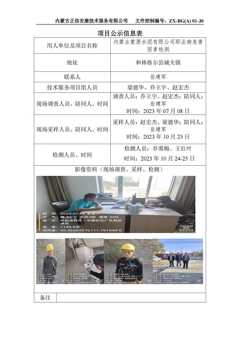 內(nèi)蒙古蒙原水泥有限公司職業(yè)病危害因素檢測(cè)