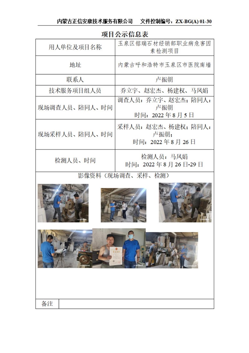 玉泉區(qū)銘瑞石材經(jīng)銷部職業(yè)病危害因素檢測項目公示信息表