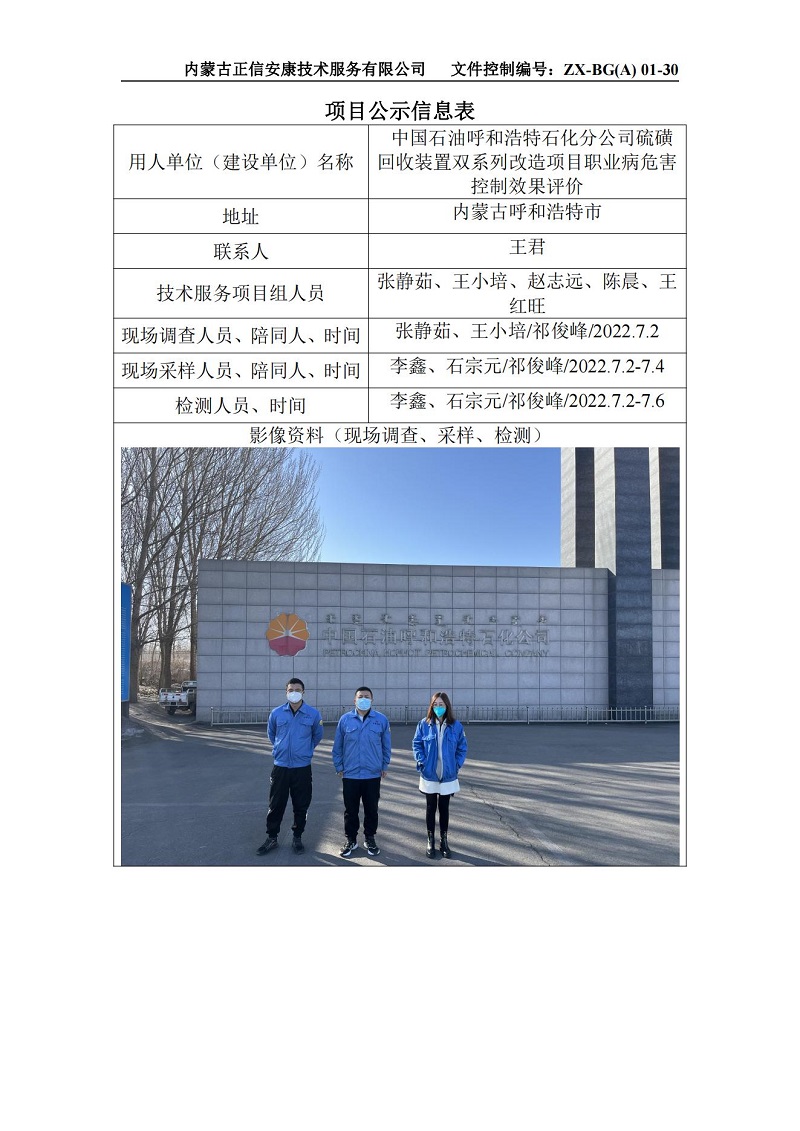 中國石油呼和浩特石化分公司硫磺回收裝置雙系列改造項(xiàng)目職業(yè)病危害控制效果評價信息公示
