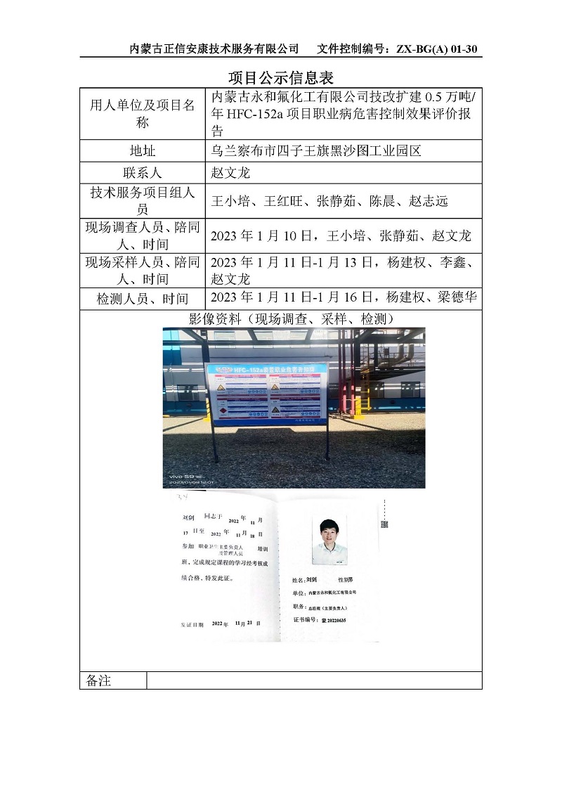 內蒙古永和氟化工有限公司技改擴建0.5萬噸年HFC-152a項目職業(yè)病危害控制效果評價公示表