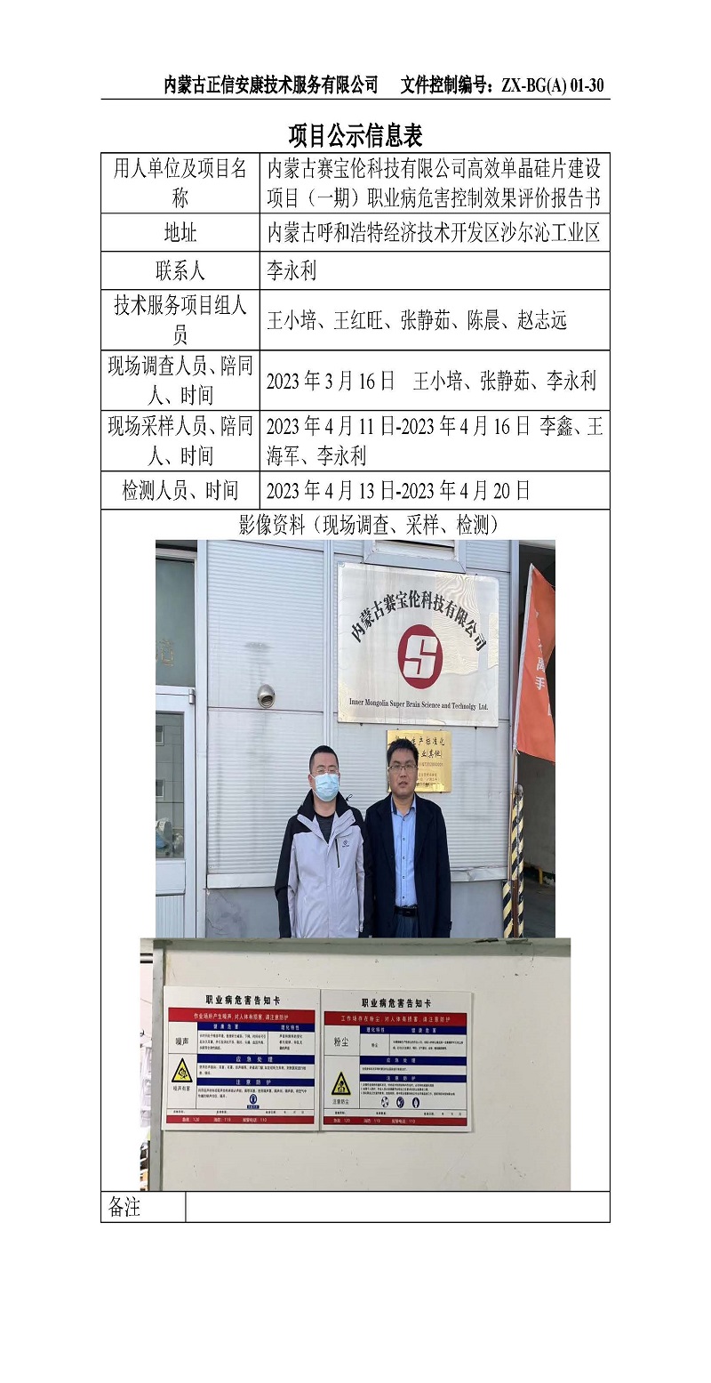 內(nèi)蒙古賽寶倫科技有限公司高效單晶硅片建設(shè)項(xiàng)目(一期)職業(yè)病危害控制效果評(píng)價(jià)報(bào)告書(shū)