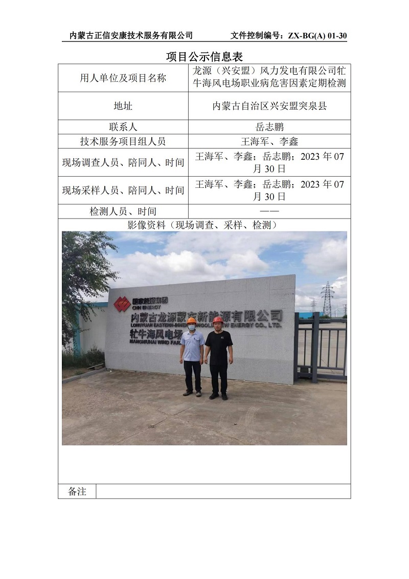 龍源(興安盟)風力發(fā)電有限公司牤牛海風電場職業(yè)病危害因素定期檢測