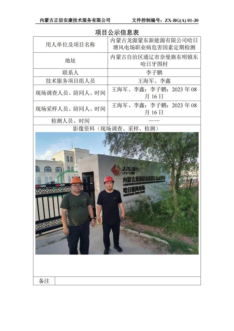 內(nèi)蒙古龍?jiān)疵蓶|新能源有限公司哈日塘風(fēng)電場(chǎng)職業(yè)病危害因素定期檢測(cè)