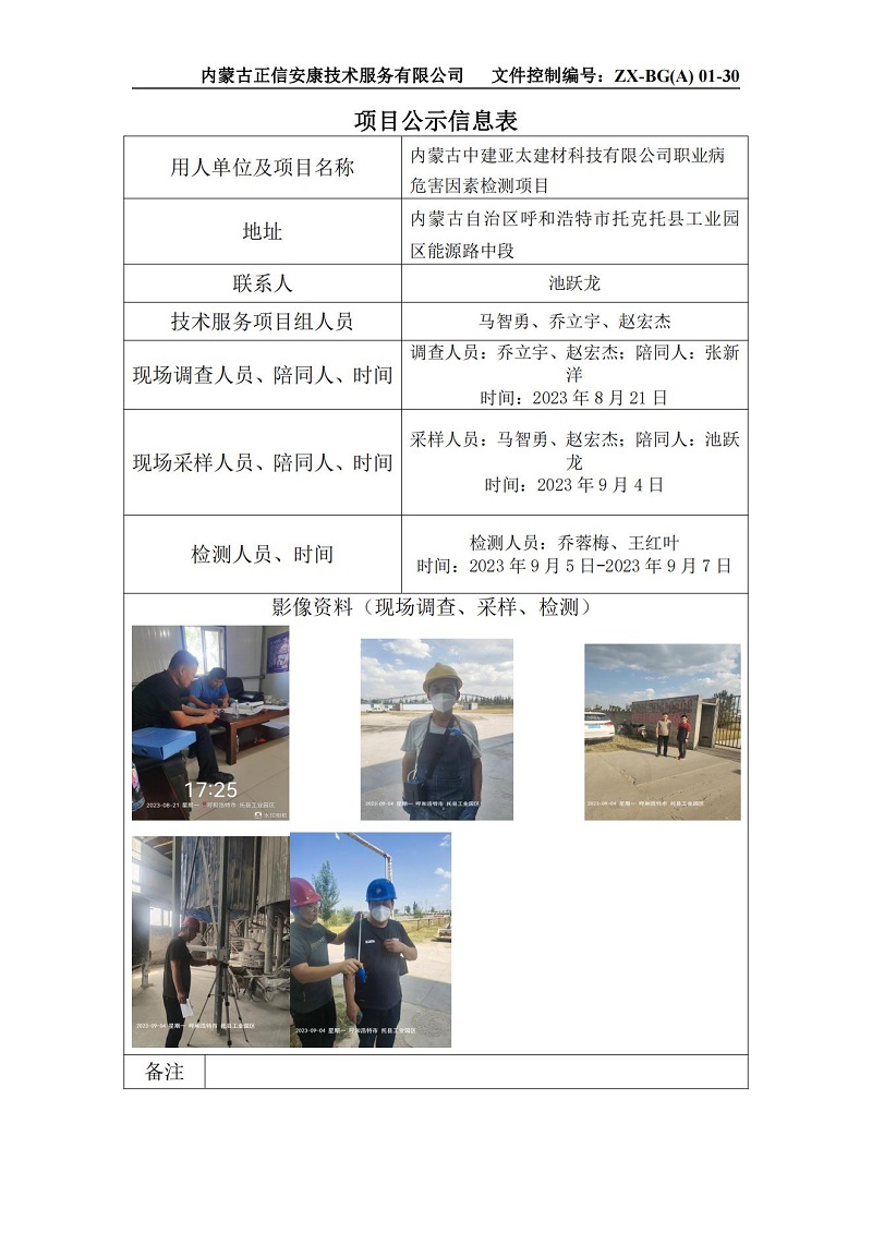 內(nèi)蒙古中建亞太建材科技有限公司職業(yè)病危害因素檢測項目公示信息表_