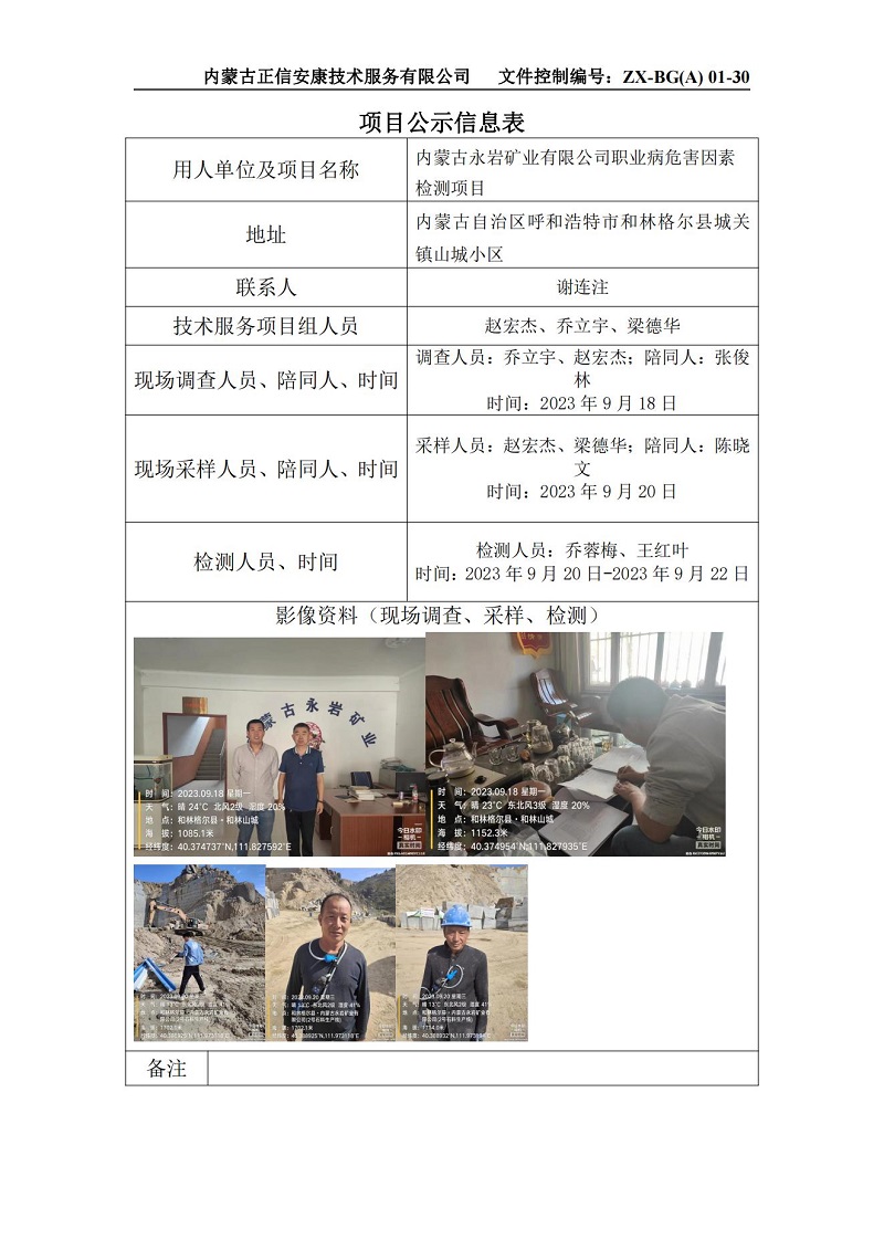 內(nèi)蒙古永巖礦業(yè)有限公司職業(yè)病危害因素檢測項(xiàng)目公示信息表